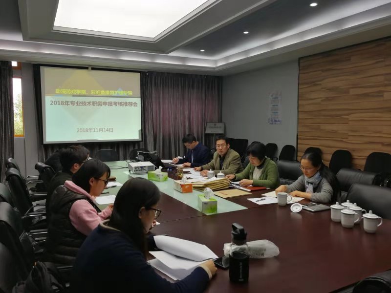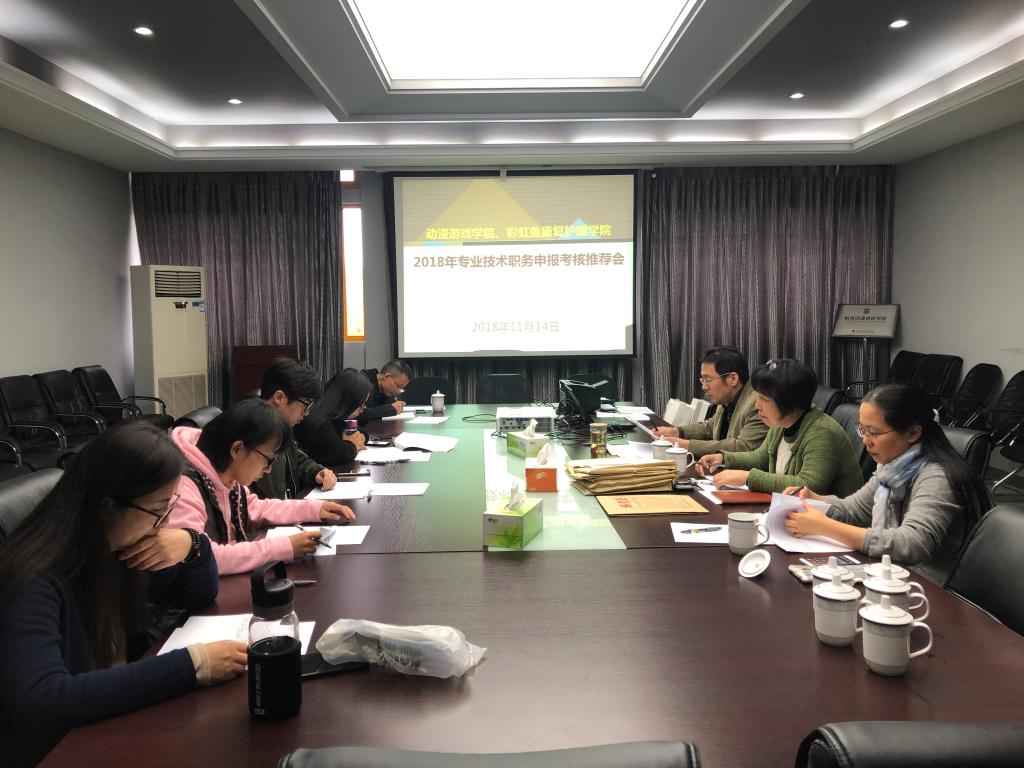 11月14日下午,动漫游戏学院、彩虹鱼康复护理学院在4307会议室召开学院2018年专业技术职务申报考核推荐组会议。学院考核推荐组成员参加会议,校人事处副处长叶青青以及学院党总支纪检委员郑慧俊列席会议。
