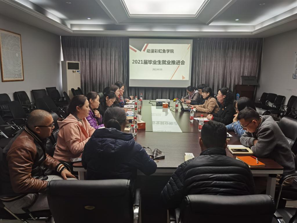 3月17日下午,动漫游戏学院、彩虹鱼康复护理学院召开2021届毕业生就业工作推进会。党总支书记沈音乐、专业负责人、学工办和全体毕业班班主任参会。会议由学工办主任许智颖主持。