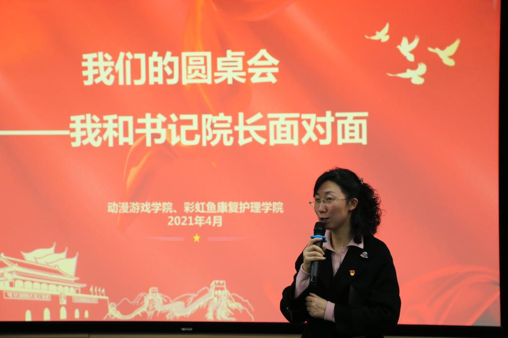 3月31日下午,动漫游戏学院、彩虹鱼康复护理学院第九期“我们的圆桌会——我与书记院长面对面”活动在4201举行。学院党总支书记沈音乐,副书记、副院长郭捷与50余名入党积极分子代表开展交流。