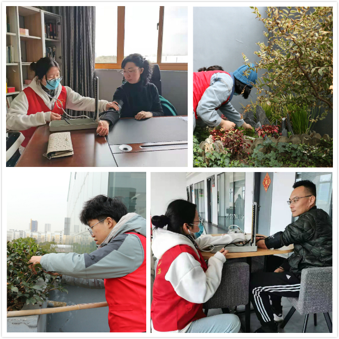 活动中,志愿者们统筹安排、各负其责、配合默契、互帮互助,提高劳动效率,提高劳动质量,立足专业开展服务。园艺专业志愿者对动漫楼室内外的植物进行养护,为植物除杂草、松土、施肥、灌溉、让植物更好的吸收营养,静待开花结果。康复护理专业志愿者们热情为老师们测量血压,细心向老师们宣讲春季预防小贴士,进行健康宣教。