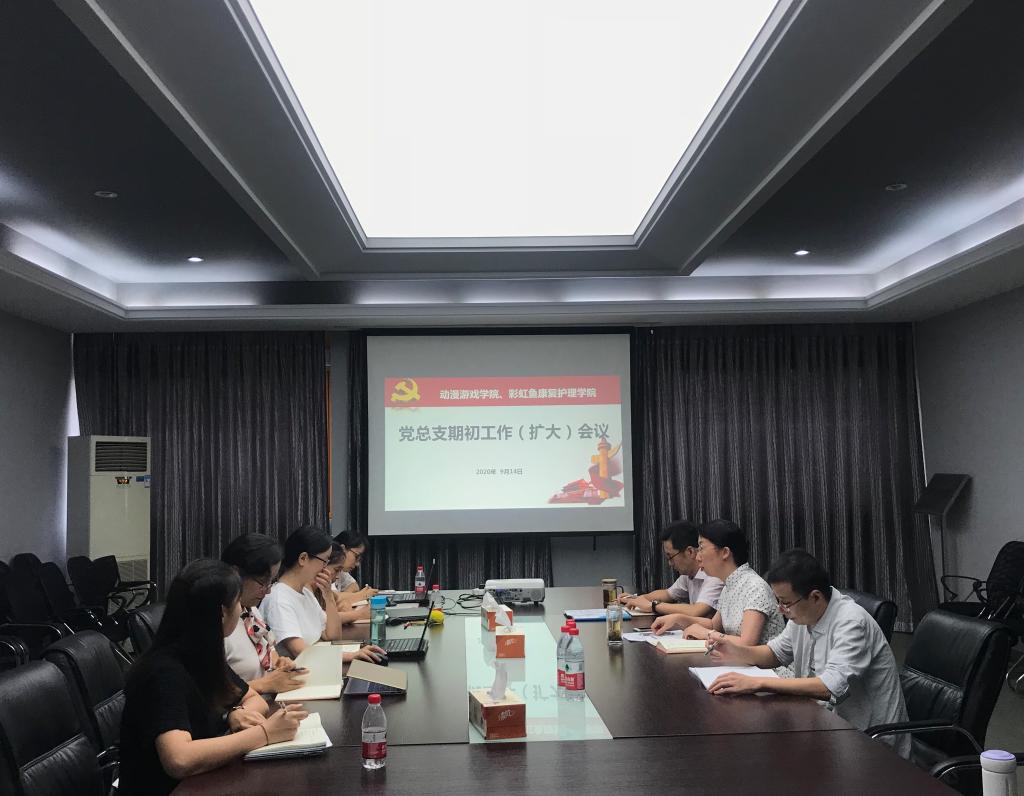 9月14日下午,动漫游戏学院、彩虹鱼康复护理学院党总支在4307会议室召开期初工作(扩大)会议,党总支委员、党支部书记参加会议,党总支书记沈音乐主持会议。