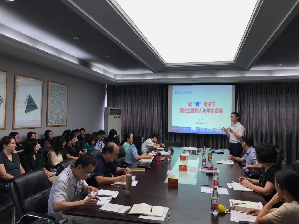 沈威以《战“疫”视域下高校立德树人与学生发展》为题,从“战疫路上,以青春之名书写无悔担当”“疫情防控视角下青年大学生责任担当实证调查——交叉分析及描述分析”等角度,结合自己在今年疫情期间实施的问卷调查数据分析,具体细致的剖析了在疫情影响下当代大学生的责任担当意识。此次党课,沈威在立德树人与学生发展工作方面向与会教师提出五点希望:工作中要多实践,用数据说话;要探索学生成长成才规律、尊重规律,按照规律开展教育教学;要懂得学生,进而提升人才培养质量;第一课堂要与第二、三课堂联动,互通信息,取长补短;要探究立德树人根本任务与学生成长发展的路径优化机制,不断推进课程思政。