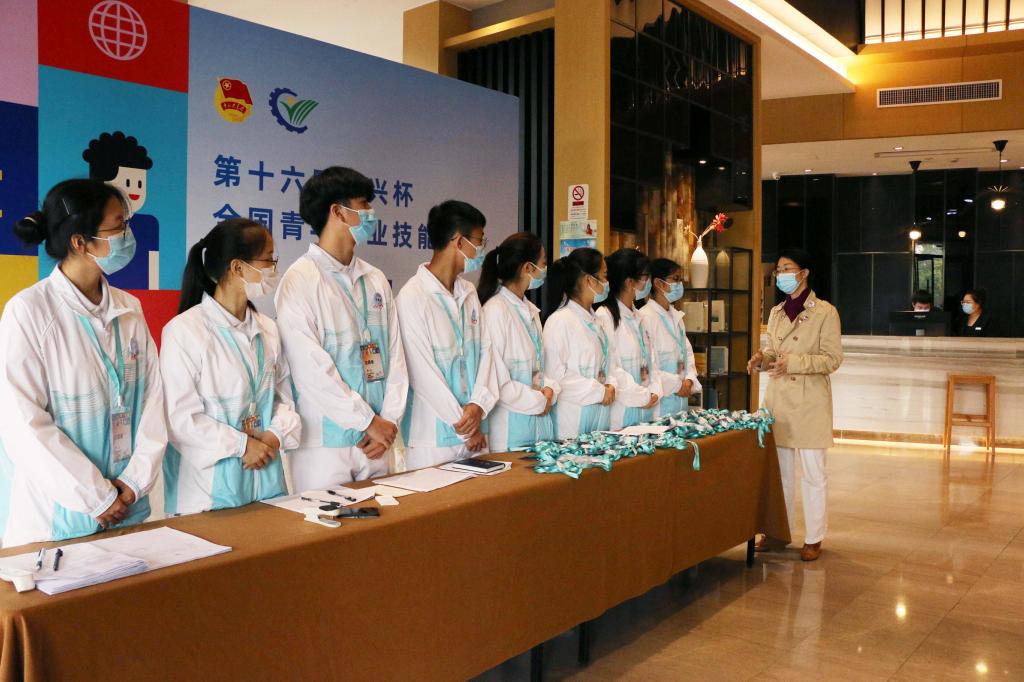 酒店组与专家接待组共有15名志愿者,主要负责做好330余名参赛选手、队伍指导老师、领队的接待与体温检测、防疫资料及专家资料收集、身份牌及选手衣物发放、入住引导与办理、开幕式人员引导等工作。沈音乐与志愿者们亲切交谈,为志愿者们送上巧克力、面包等贴心的能量补给食物,鼓励大家从做好每一件小事入手,传递微笑,传承志愿服务精神,展现杭职形象。
