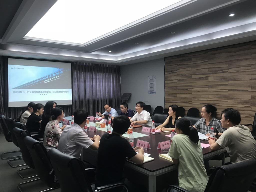 8月12日下午,校长徐时清,党政办、人事处、专业建设指导处(双高办)、财务处、学工部等部门负责人一行到动漫游戏学院、彩虹鱼康复护理学院调研,分院班子成员、各专业负责人、三办及实训室负责人等参加。