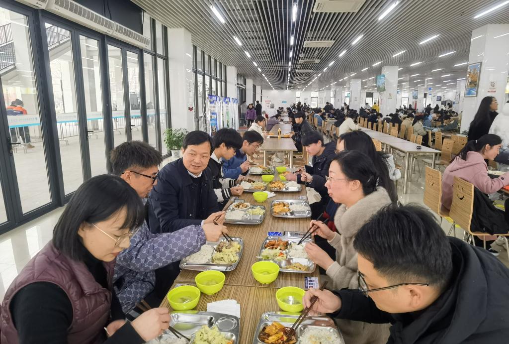 在学生食堂,金波与学生一起排队打饭,围桌而坐,边吃边聊,气氛温暖融洽。金波关切地询问了学生们的学习生活情况,详细了解了学生对专业教学、后勤服务等工作的满意度和意见建议。当了解到在座有退伍复员学生时,他鼓励学生要将部队中的优良作风延伸到自己的学习和工作中,并带动身边的同学共同进步。