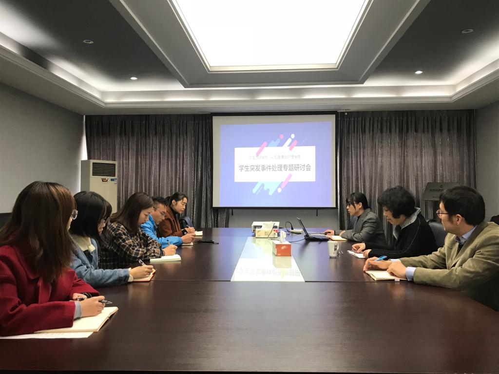 为加强学生安全管理,进一步提高辅导员应对学生突发事件的紧急处理能力和水平,维护校园稳定,促进校园和谐,11月27日上午,动漫游戏学院、彩虹鱼康复护理学院学工办在4037会议室召开学生突发事件处理专题研讨会。党总支书记茅千里、副书记郭捷学工办全体成员出席本次会议,学工办主任许智颖主持会议。