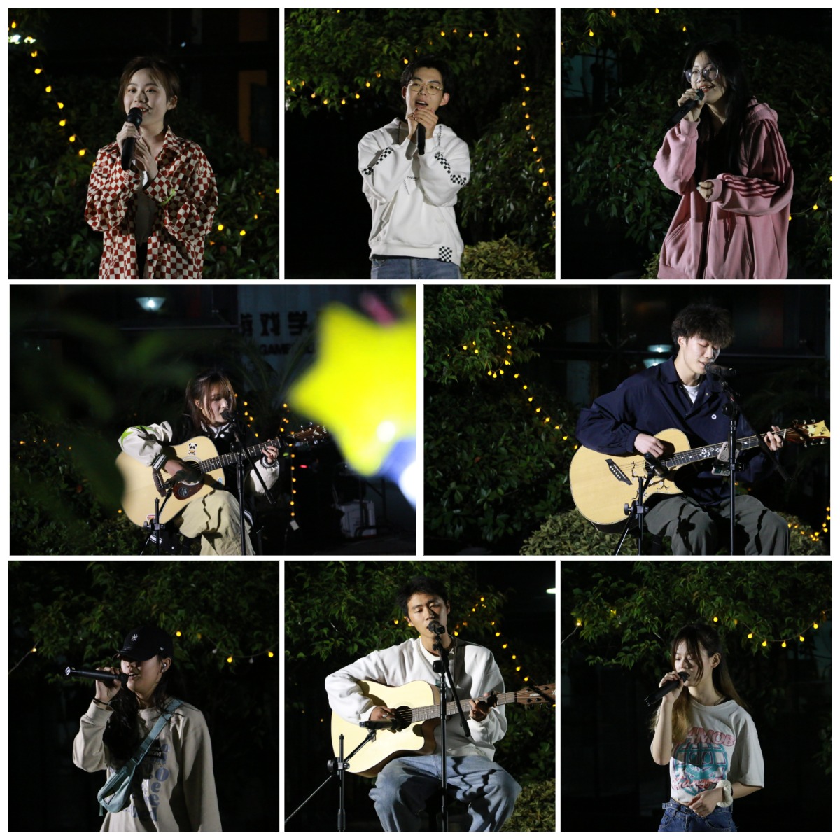 春韵歌会上,同学们积极报名,以歌曲演唱和吉他弹唱两种形式为主。歌会没有刻意设置听众席,大家分散围坐在动漫楼四周,自在惬意。一曲《大鱼》拉开了音乐会的序幕、现场吉他动人的和弦萦绕在每个人的耳边,青春的气息扑面而来,美妙的歌声回荡在融池岸边。在音乐会中,《微微》《花海》《光年之外》《等你下课》等几首耳熟能详的歌曲,引发现场大合唱并将歌会推向高潮,整个歌会持续了近两个小时。