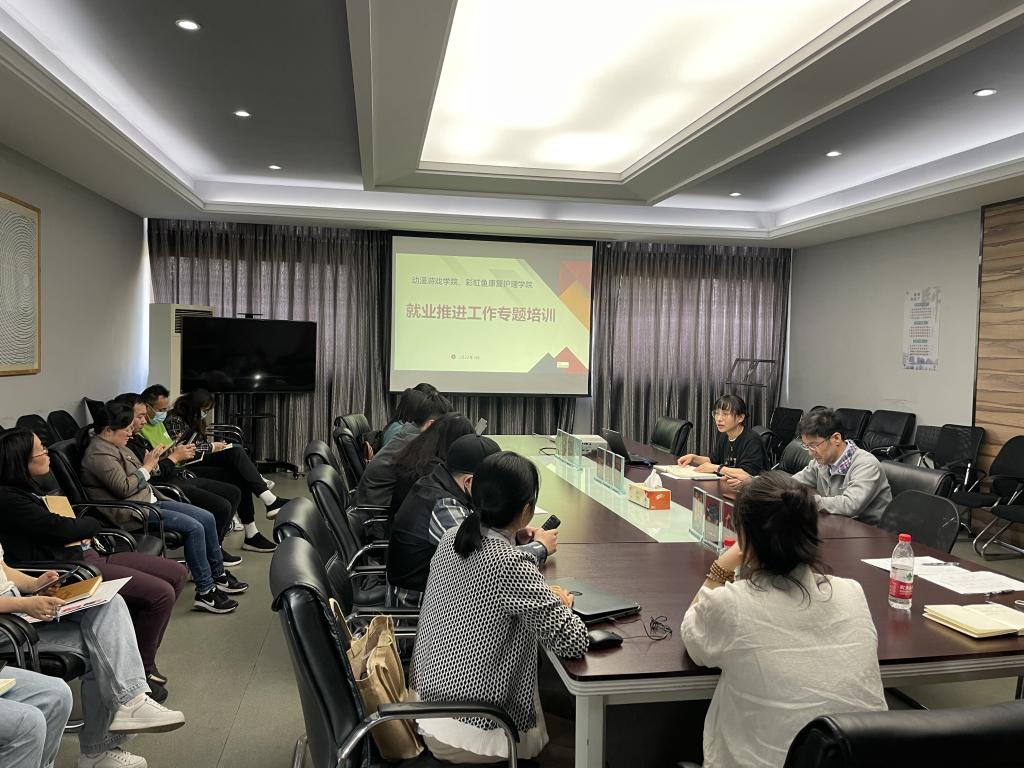 5月4日下午,动漫游戏学院、彩虹鱼康复护理学院召开2022届毕业生就业推进专题培训,副书记副院长郭捷、学工办主任、就业辅导员、毕业班班主任和实习指导老师参会。会议由许智颖主持。