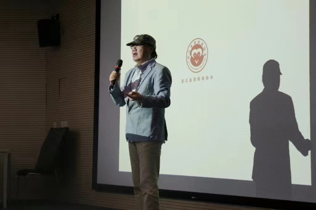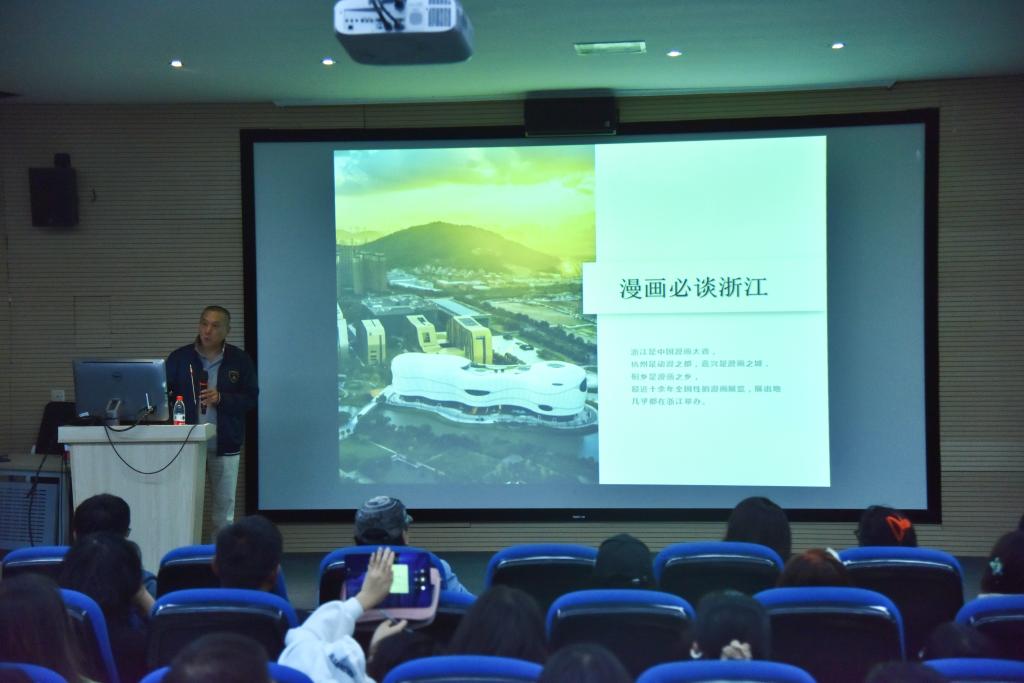 浙江省漫画家协会副主席、著名绘本艺术家江建文指出,漫画是以思想为主的艺术,现在既有审美又有功能的漫画作品和优秀漫画家还有待进一步发掘,鼓励在座的同学们要提高思想认识、注重知识积累、加强手上功夫,为中国式漫画的发展贡献更多的智慧。江副主席还现场为同学们展示了《杭州故事》等一系列自创作品,引得同学们的阵阵热烈掌声。