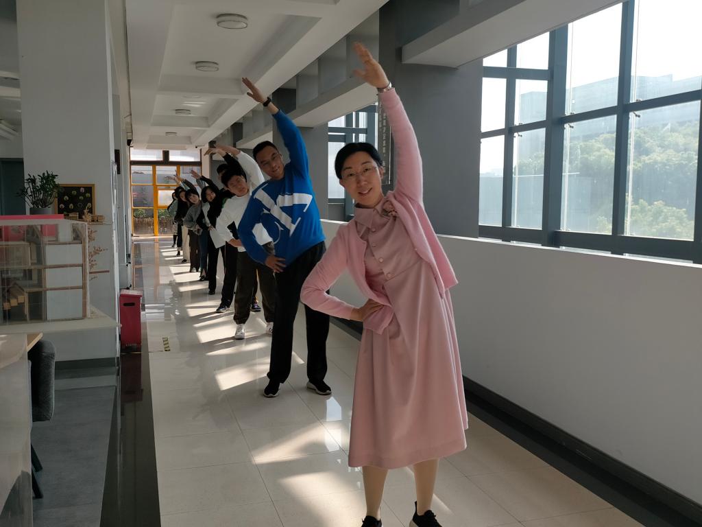 在动漫楼三楼走廊,每天上午9:40,迎着明媚的阳光,伴随着轻快的广播操旋律,在党总支书记沈音乐的带领下,动漫游戏学院的教职工们井然有序地排着队伍,整齐划一地做着每一个动作,脸上洋溢着幸福的笑容。