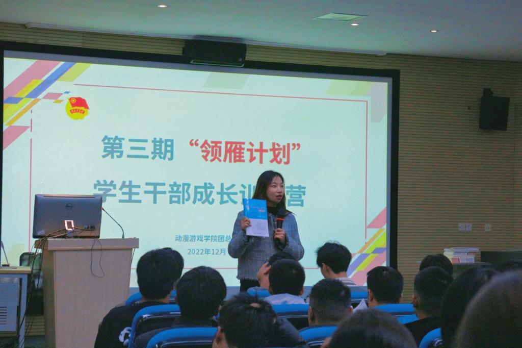 为深入学习习近平新时代中国特色社会主义思想,认真贯彻落实党的二十大精神,进一步强化“青马工程”为党育人的政治功能,持续加强动漫游戏学院学生干部队伍建设,12月8日,动漫游戏学院开展第三期“领雁计划”学生干部成长训练营。学院各班级班长、团支书、团总支及学生会全体成员参加。