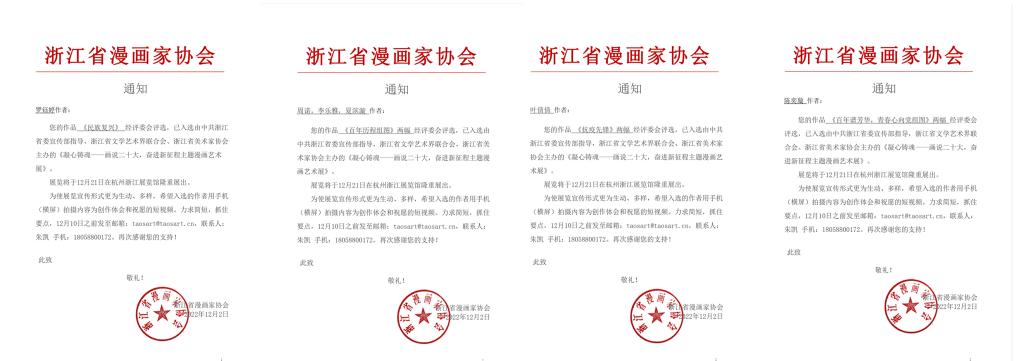 由中共浙江省委宣传部指导,浙江省文学艺术界联合会、 浙江省美术家协会主办的《凝心铸魂——画说二十大, 奋进新征程主题漫画艺术展》 于12月21日在杭州浙江展览馆隆重展出,本次展览以传达学习党的二十大精神作为创作主题,把会议精神文字的要点创作为主题鲜明的画面感,以达到更生动的宣传效果。展览特设选题42项,并采取名家邀约和高校邀约两种形式征集稿件,并根据作品的立意准确性,内容的丰富性,表现的艺术性等方面决定最终的入选数。动漫游戏学院数字媒体艺术专业罗钰婷,周诺,动漫专业的叶倩倩,陈奕璇作品入选。动漫游戏学院坚持开展课程思政建设,将专业知识与思政内容相结合,全过程育人。