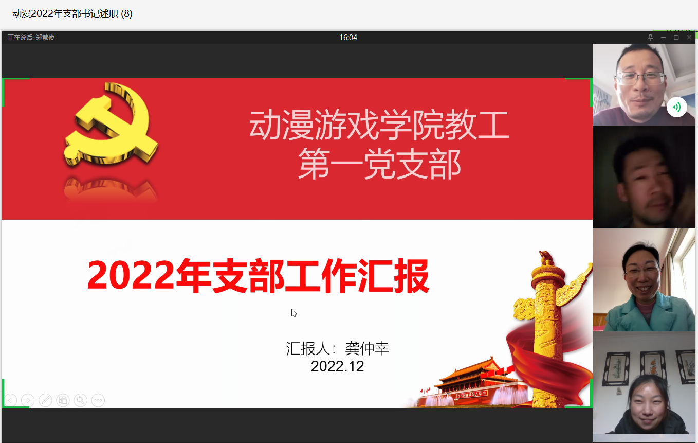为认真学习宣传贯彻党的二十大精神,进一步落实管党治党政治责任,推动全面从严治党向党支部延伸,12月22日,动漫游戏学院党总支在线上召开2022年度党支部书记抓党建述职评议考核会。党总支书记沈音乐、党总支副书记郭捷、总支委员、各党支部书记、党员代表参加了会议。