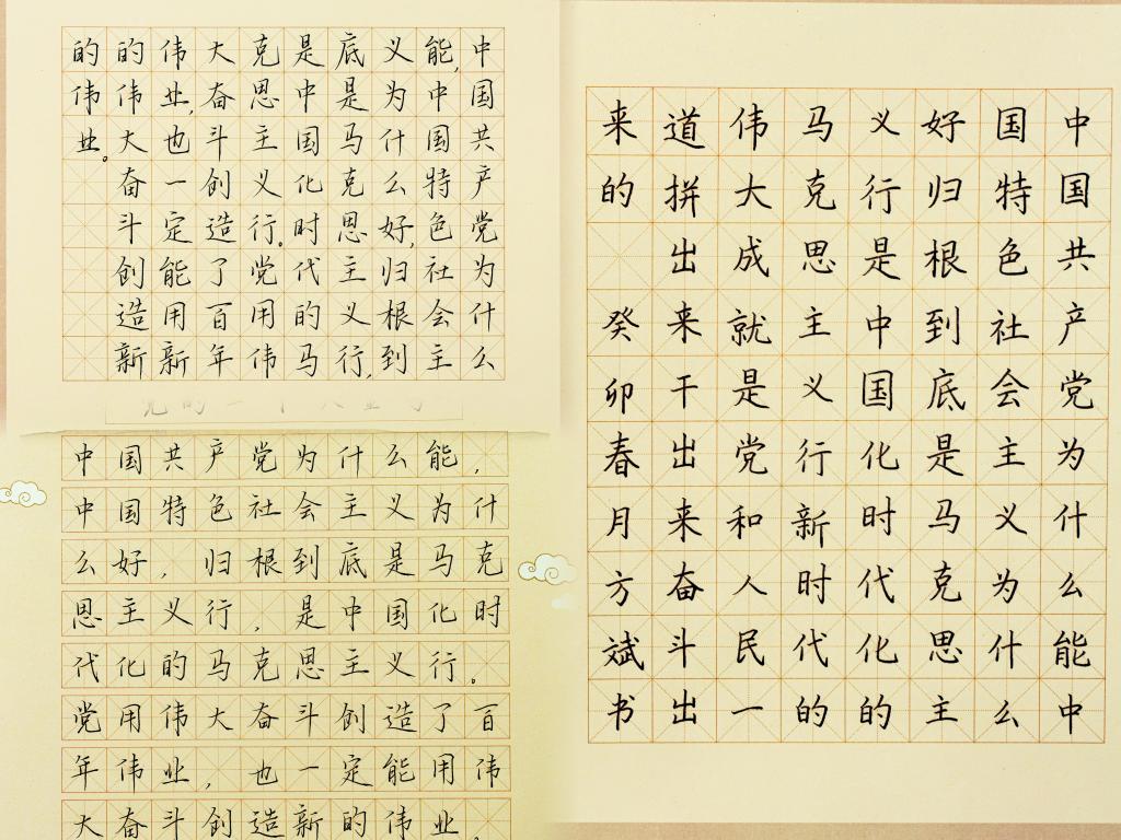 经过比赛前期的宣传,共有400余名同学参加初赛,经过评委评定,有22名同学进入决赛的现场书写环节。“中国共产党为什么能,中国特色社会主义为什么好,归根到底是马克思主义行,是中国化时代化的马克思主义行!”报告中一句句闪耀着思想光芒的“金句”,寓意深远,直抵人心,让人倍感振奋。不驰于空想不骛于虚声,在现场,同学们一幅幅书法作品,彰显一颗颗赤诚的爱国之心,黑白相合尽显风采,方寸之间崭露锋芒,苍劲有力书的是时代,刚毅端正写的是丹心。