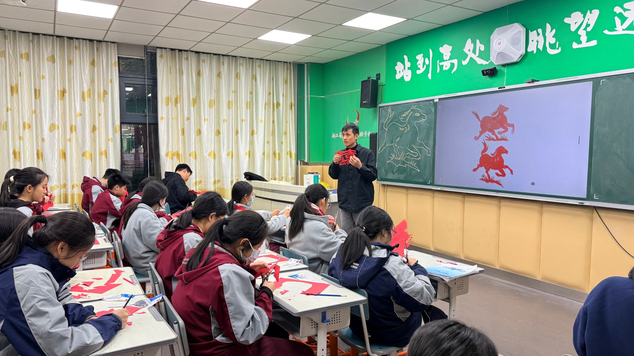 孔超老师带领同学们开展以“马”为主题的剪纸实践。课堂氛围轻松愉悦,同学们热情高涨,指尖翻飞间,奔腾骏马、卡通萌马等形态各异的作品相继诞生,满含童趣与巧思。活动尾声,大家踊跃展示成果、交流心得,脸上洋溢着收获的喜悦。