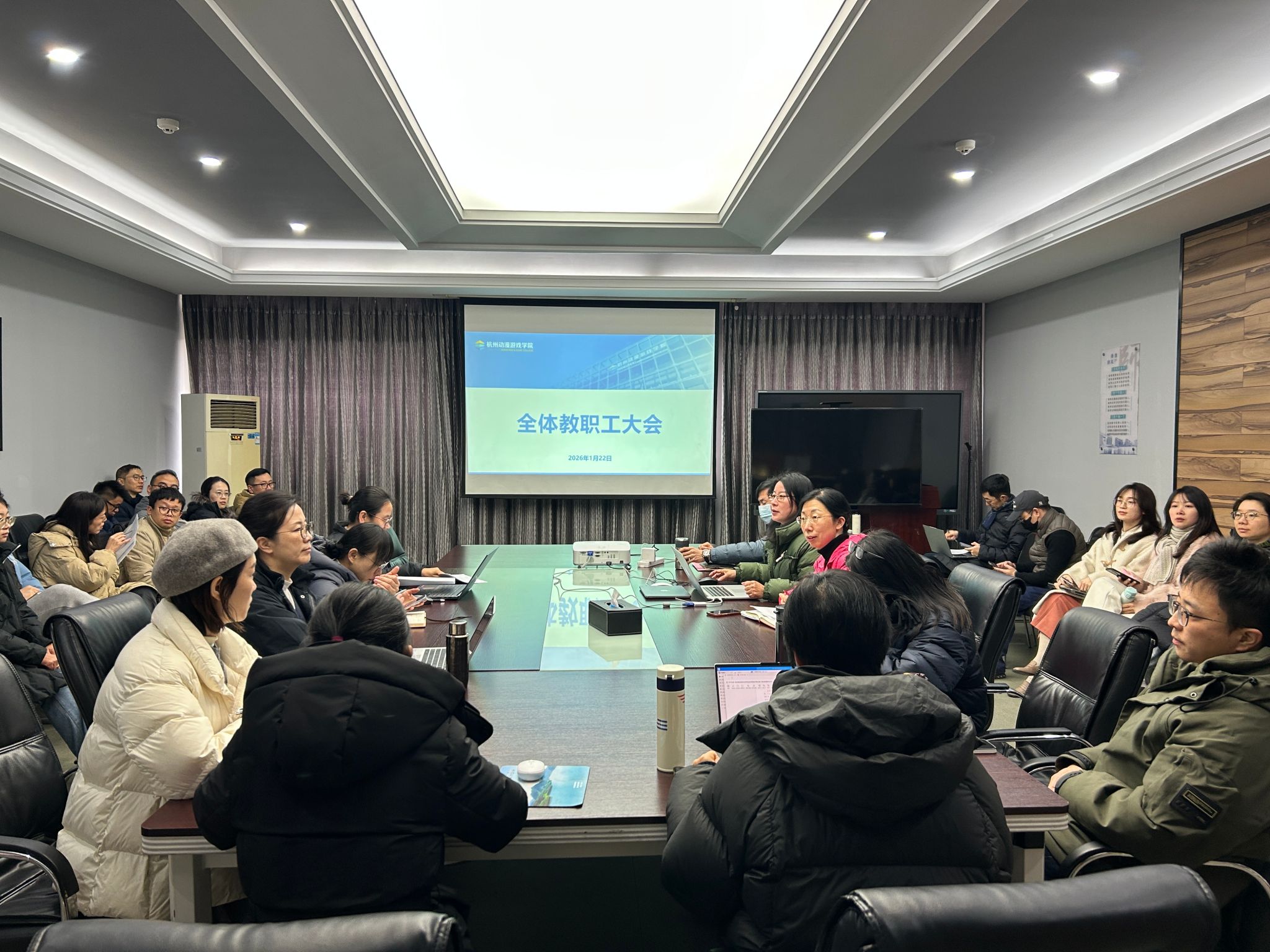 2026年1月22日,动漫游戏学院在4307会议室召开期末全体教职工大会,全面总结本学期工作,部署新学期重点任务,分院领导班子及全体教职工参会。